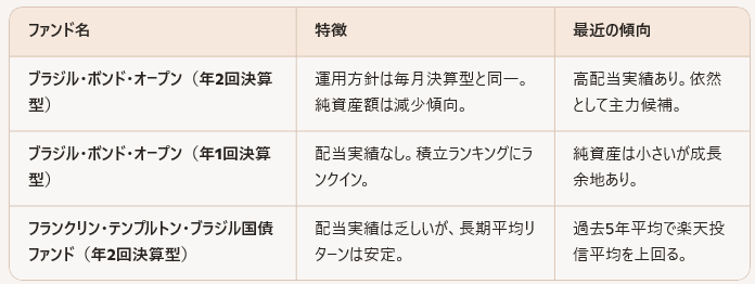 楽天証券で新NISA対象となるブラジル債券ファンドは依然として限られています。2025年時点でも主力は以下の3本。
