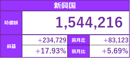 一番の伸びたのは主力eMAXIS Slim 新興国株式インデックスの+9%超🔥