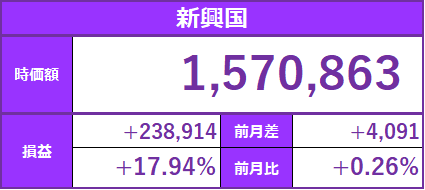 新興国はブラジル債券とアフリカETFが4%超のプラスとなる一方、主力のeMAXIS新興国とベトナムが微減となり、全体としては微増にとどまりました🌻