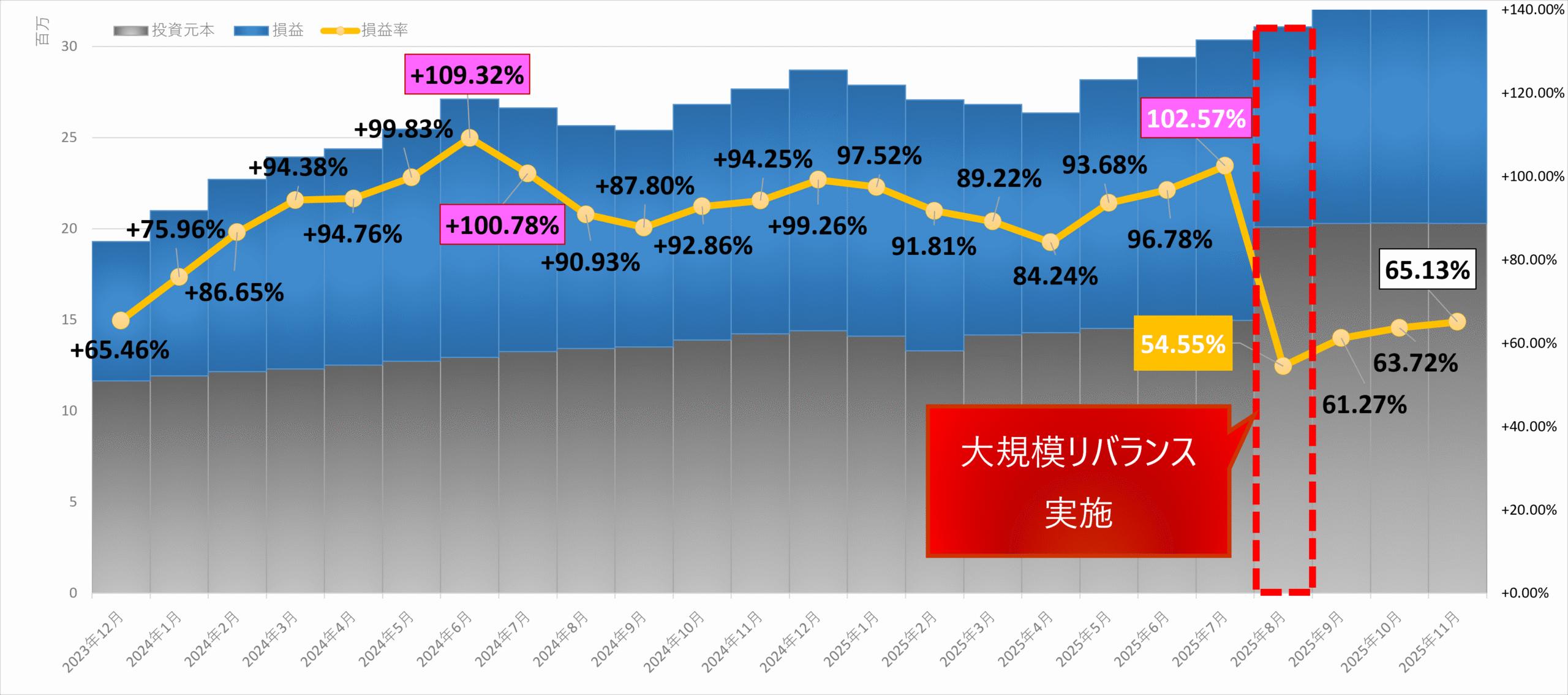 総資産は7ヶ月続伸、損益率はリバランス以降3ヶ月続伸となりました㊗️🎊🎉