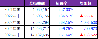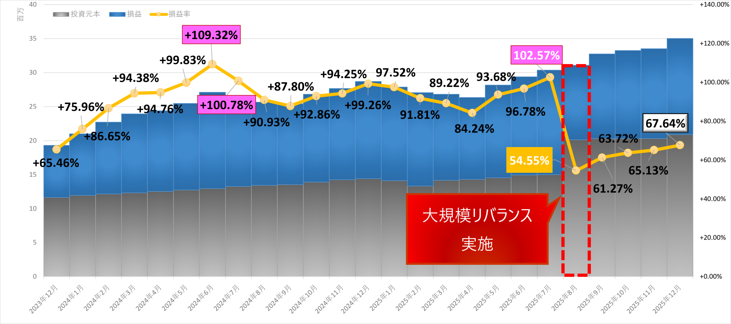 損益率は、総資産ダブルバガーを達成した後に、大規模リバランスを行ったため低下。