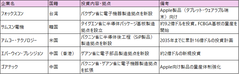 これらの企業は、米中摩擦やサプライチェーンの再構築を背景に、ベトナムを「次世代の製造ハブ」として位置づけています。特に北部地域(バクザン省・バクニン省・タイグエン省など)は、インフラ整備と人材確保が進んでおり、電子産業の集積地として注目されています。