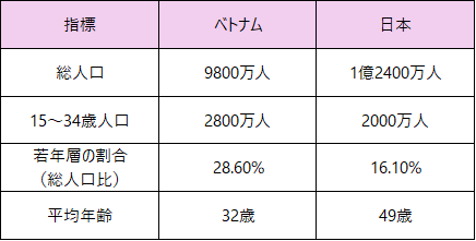若年人口の多さと消費市場の拡大が、内需主導の成長を支えています。ベトナムは人口の約3割が若年層で、労働力としての潜在力が非常に高いです。現在「人口ボーナス期」にあり、経済成長を支える若い労働力が豊富です。