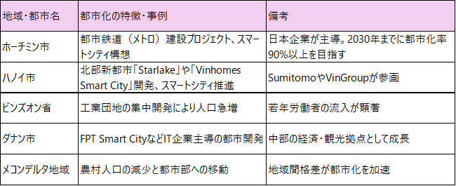ドイモイ政策(1986年〜)以降、農村から都市への人口移動が加速しており、工業団地の開発が都市人口の増加を牽引しています。スマートシティ構想により、ICT・環境配慮型の都市開発も進行しています。