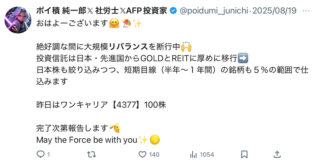 GOLD/REITもトータル25%前後の範囲で維持していきたいと思います🫡