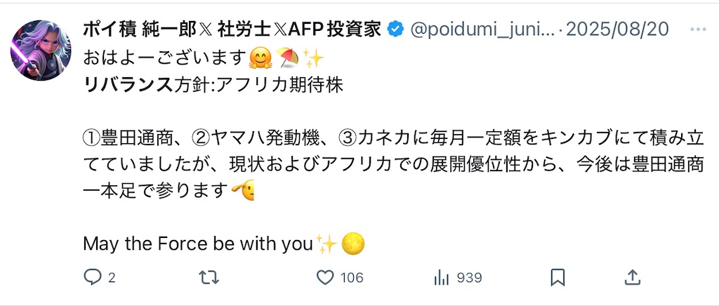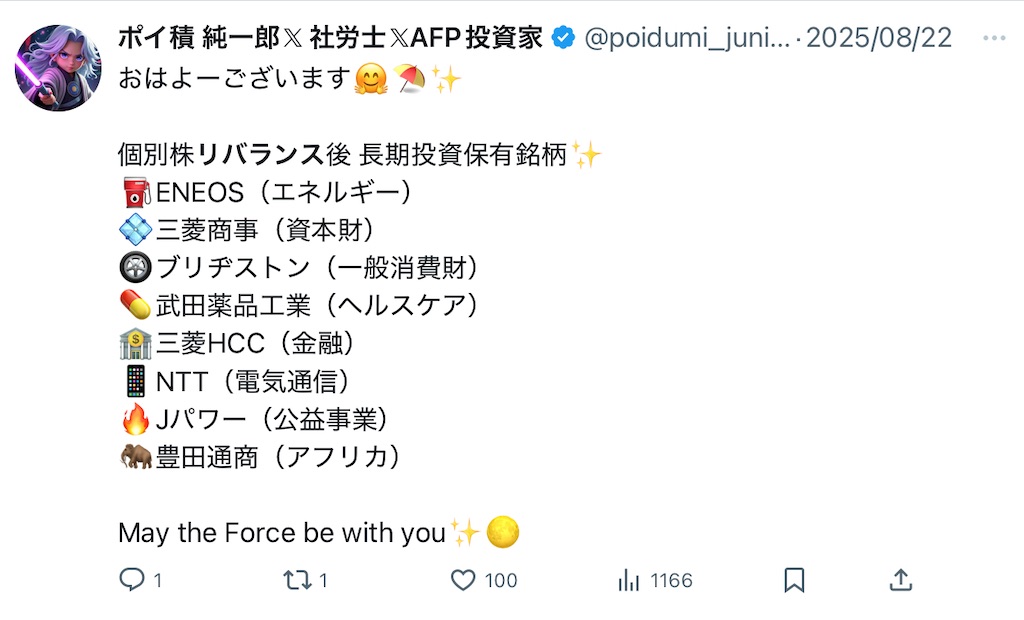 ポイの総資産については、2024年6月の絶頂期に、損益率+109.32%と総資産ダブルバガーを達成、翌7月もダブルバガー状態を維持したものの、以降下落傾向2025年4月には1年以上ぶりに損益率+80%台まで落ち込みました。