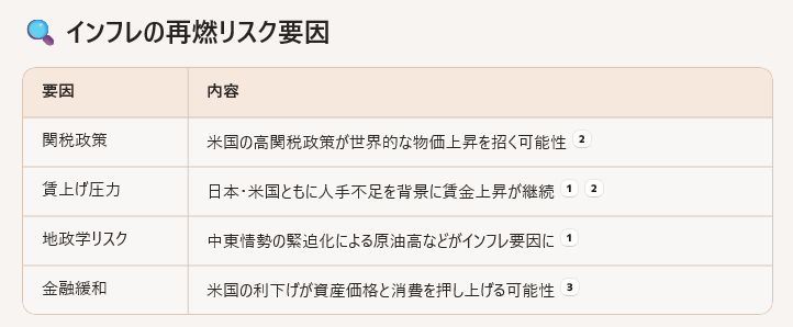 - FRBは利下げの可能性を示唆しており、金融緩和がインフレ圧力を再び高める可能性がある。